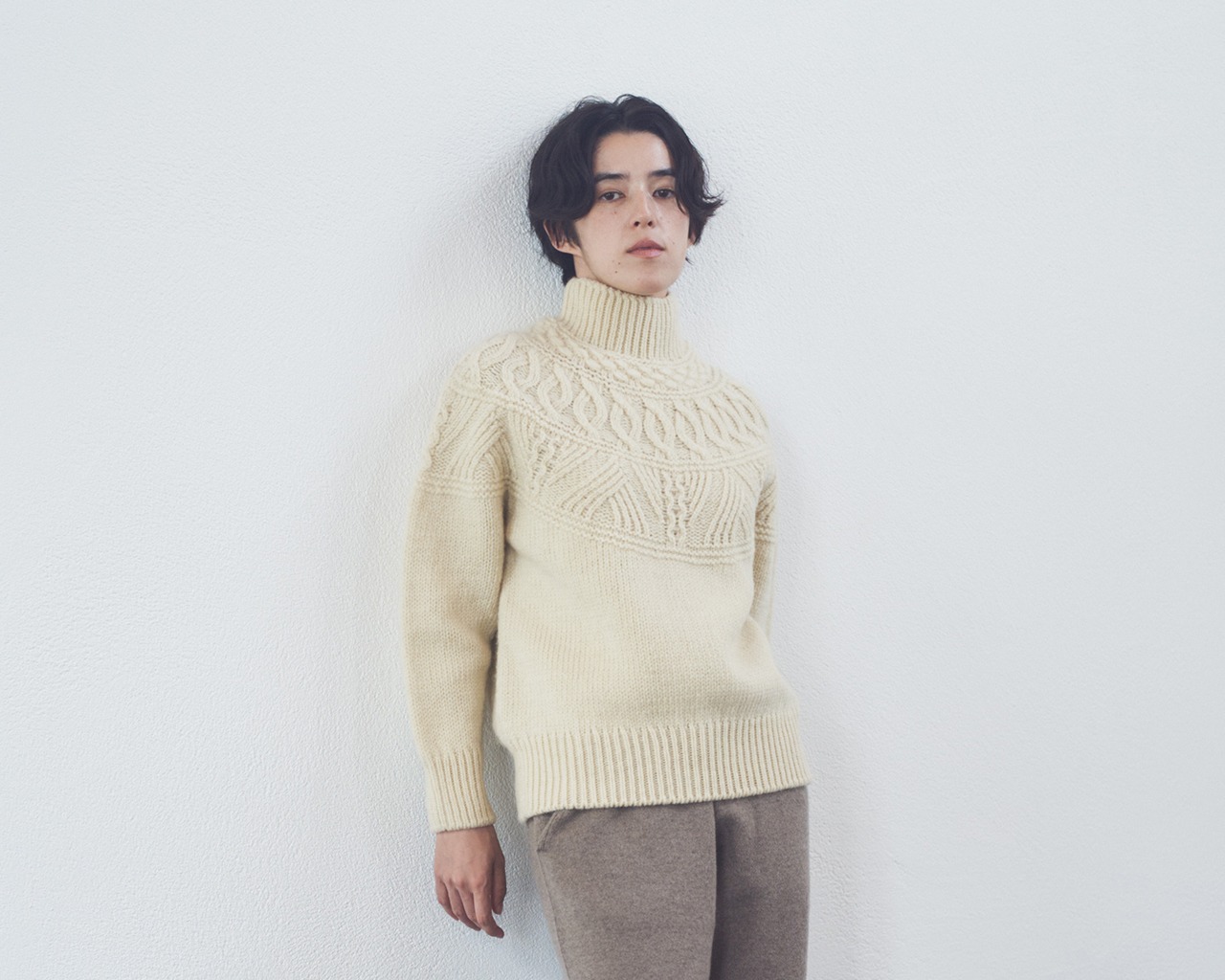 交差する編み模様をていねいに表現しながらも、日常に取り入れやすいシルエットに仕上げた、技術と感性を込めた一着が編み上がりました。