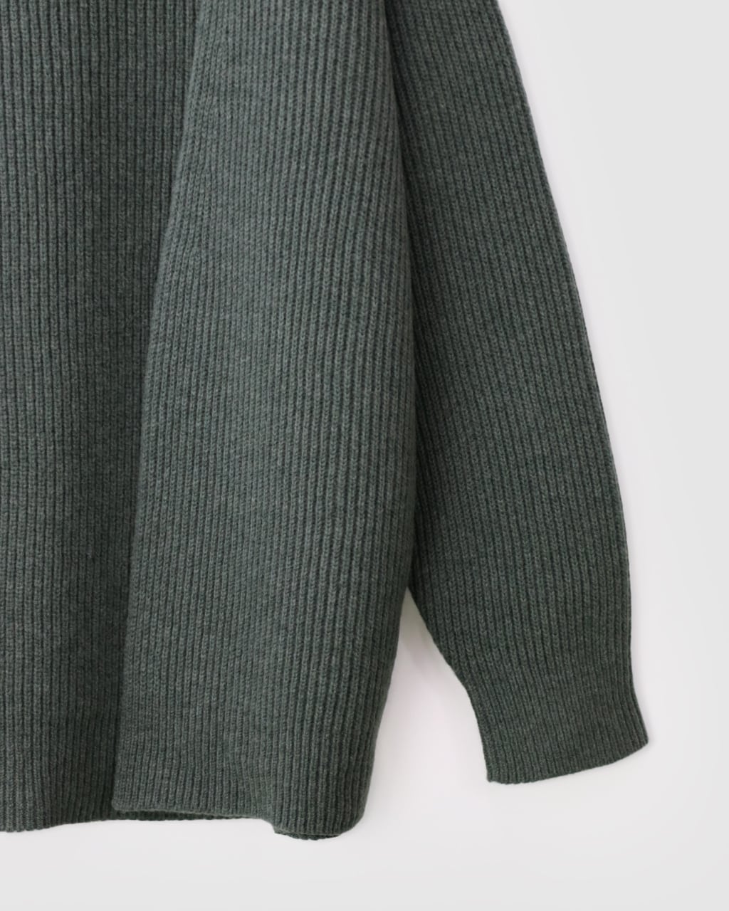 通常ニットウェアは、前身頃、後身頃、袖といったパーツを別々に編成して縫い合わせることによってできています。それとは対照的に、ホールガーメント製法でできた本商品は、一着まるごと編み機から直接、立体的に編み上がります。そのため裁断や縫製といった後工程が不要となり、必要最低限の素材で編み上げることができ、あとで廃棄となってしまう余分な端布がでません。また縫い目がないことで、肌をチクチクさせるような余計な引っかかりなく、仕上げることができます。