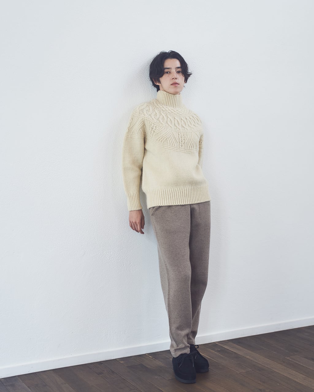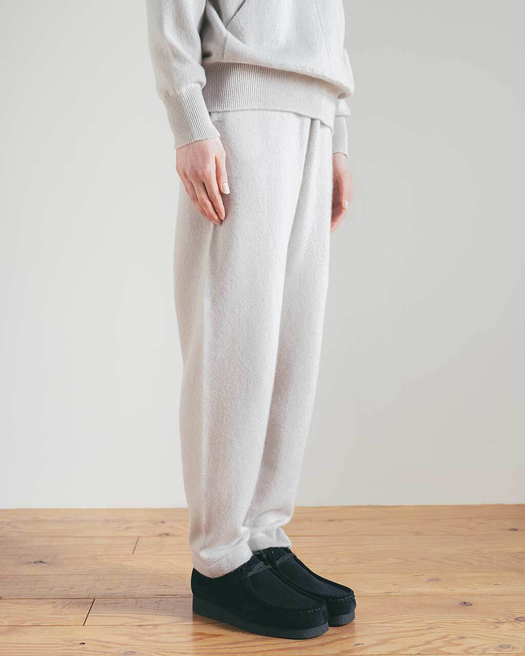 カシミヤ100%なので保温性・保湿性に富み、とにかく暖かい。家でも外でも、ゆっくり着られるパンツです。