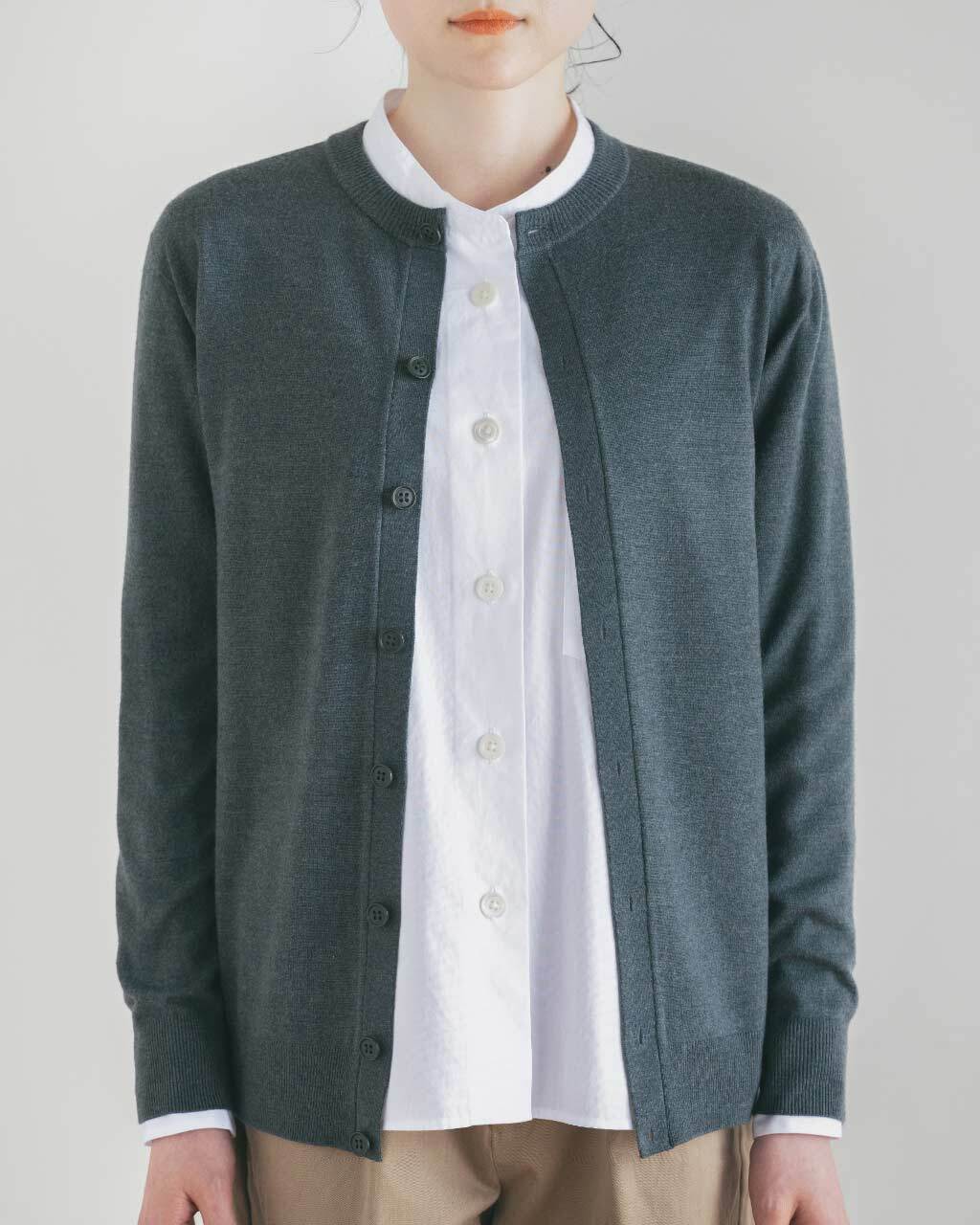 凹凸のない編地は引っ掛かりがなく、すっと腕を通り、しなやかにつつみこみます。襟と前立てをそれぞれ編んで縫製し、身頃を支える丈夫なつくりになっています。